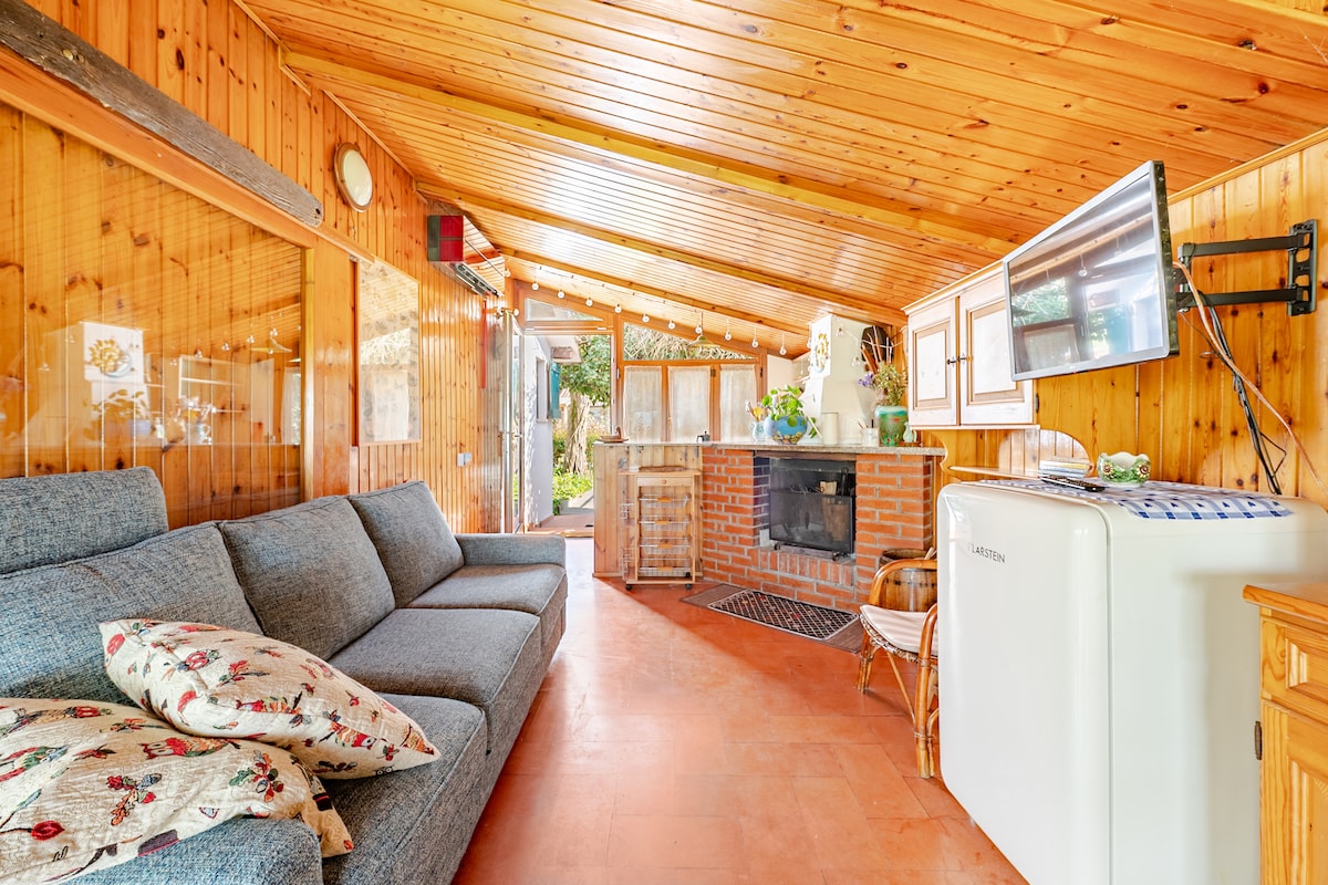 Chalet de madera de dos dormitorios con estufa de leña y barbacoa, en un prado muy tranquilo y arbolado compartido con la casa del propietario. Un paraíso para caminar, andar en bicicleta, relajarse, escribir, dibujar, meditar, hacer yoga en bosques de robles y castaños, pastos con hierbas y flores silvestres, viñedos y olivares cubiertos de maleza y un pequeño lago. El chalet no es lujoso, pero contiene todo lo que necesitas para una estancia lejos de todo inmerso en la naturaleza. El acceso es accidentado, pero se puede conducir por una pista de 1 km.