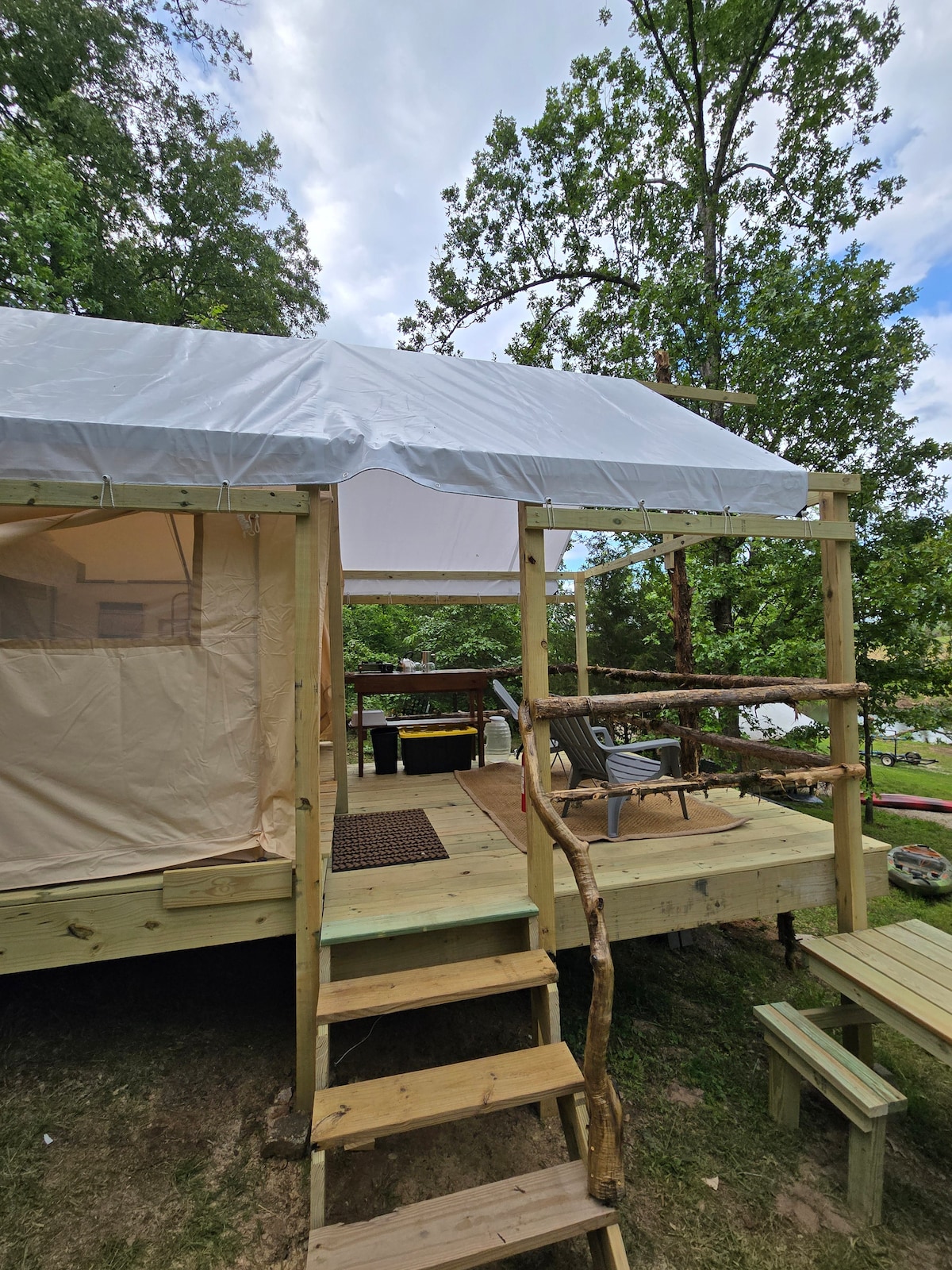 Sitio de glamping con acceso al río Finley. Campamento primitivo en su máxima expresión. A 5 minutos a pie del río. Con una ubicación céntrica, a 20 millas al sur de Branson, y Bass Pro a 20 millas al norte. - Sin electricidad, con luces solares. - Cama de matrimonio - Zona para hacer fogatas y parrilla. - letrina - Mesa de picnic. - Enfriador de iglú de agua dulce - techo de metal - Tiendas de campaña adicionales $ 35 por tienda de campaña Se admiten mascotas, pero NO se deben permitir en la ropa de cama o la alfombra. Si se deja pelo de perro en la ropa de cama, hay un cargo de $30.