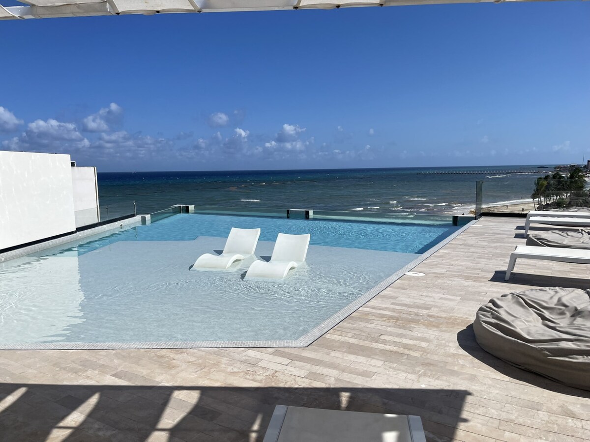 Wake up to a Priceless Caribbean oceanfront view. Enjoy your own plunge pool in terrace. Head downstairs for beach access. Walk everywhere…distance to the 5th ave and many other shopping & dining options. Gourmet restaurant in building & rooftop infinity pool. Gym Este lugar tiene una ubicación estratégica: ¡será muy fácil planear tu visita! estrategicamente ubicado frente al mar con los mas famosos clubs de playa justo al lado, area vibrante y a cinco minutos caminando de la quinta ave