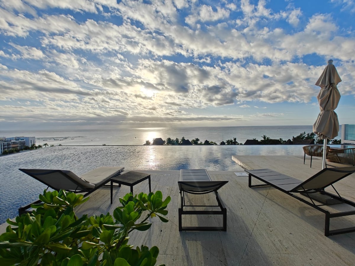 - Estudio espectacular con vista al mar, cama king y una cocina totalmente equipada. - Alberca en el roof con envidiable vista al mar caribe y playa del carmen, gym y un restaurante en el edificio. - Wifi de alta velocidad, contamos con estacionamiento subterráneo. - Estamos en una increíble ubicación, a unos pasos de la 5ta y estamos junto a 2 Club de Playa (Si eres sensible al ruido, este lugar no es para ti.) - Escápate con tu pareja y disfruta de unos días de sol en el caribe.