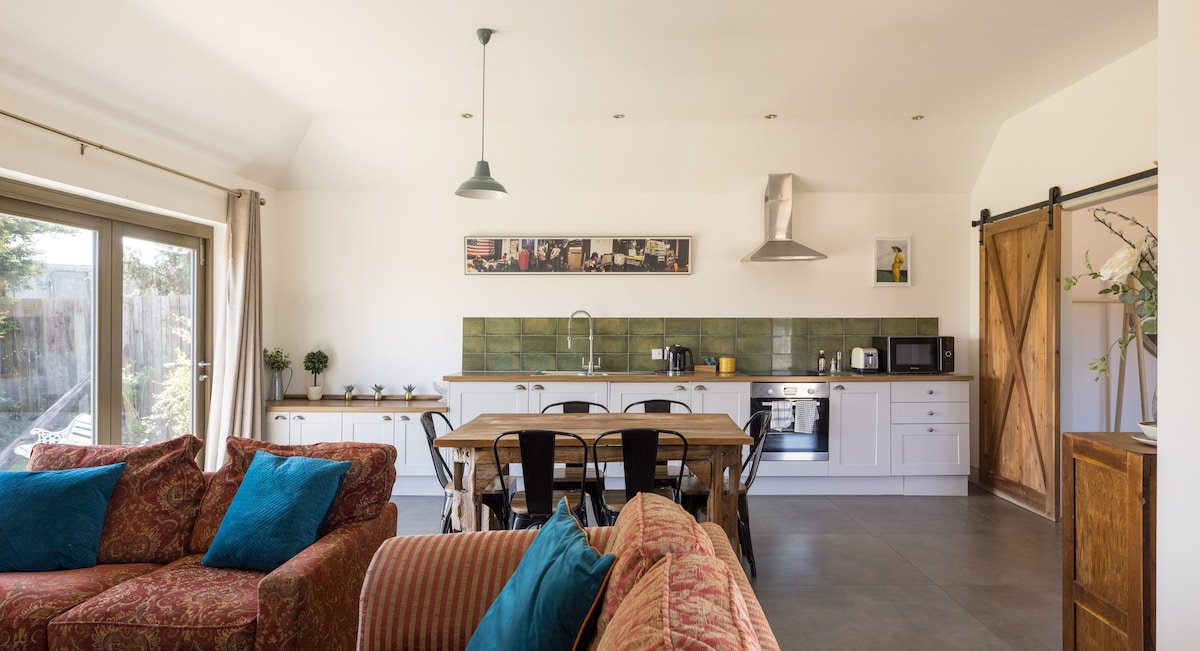 Escápate a esta residencia exquisitamente rediseñada rodeada de campos verdes. La casa cuenta con puertas corredizas de granero, una mezcla ecléctica de antigüedades y elegantes piezas vintage, y acceso a una hermosa bañera de hidromasaje privada (SE APLICA UN CARGO POR LA BAÑERA DE HIDROMASAJE PARA EL RESTO DE MARZO) con vistas al campo y una zona de barbacoa compartida. El granero Lily viene con dos dormitorios tamaño king. La cabaña Sheringham se puede agregar bajo petición por una tarifa adicional, proporcionando un tercer dormitorio. Tratamientos de spa opcionales en el interior de Tiny House Retreats.