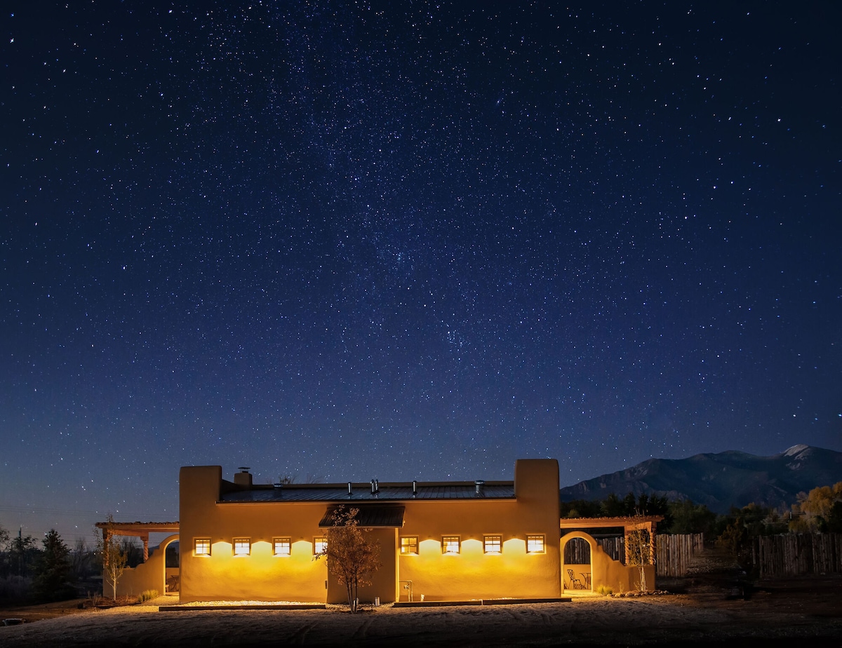 Set on 30 acres of private land on the western edge of town, Taos Skybox "Galaxy" is a unique vacation home experience, purpose-built to take advantage of the dark skies and endless vistas of the high desert landscape. Sitting at 7,000 ft. above sea level, views abound, as your retreat borders Taos Pueblo Native lands, yet is only 15 minutes from the Taos Plaza. Truly a memorable destination, Galaxy is modern and well-equipped with TWO bedrooms, a full kitchen, laundry, and fiber optic internet!