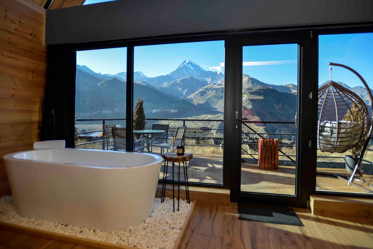Diviértete con toda la familia en este elegante lugar. En el corazón de las montañas Kazbegi. Pace tiene una vista panorámica increíble con su propio patio.
