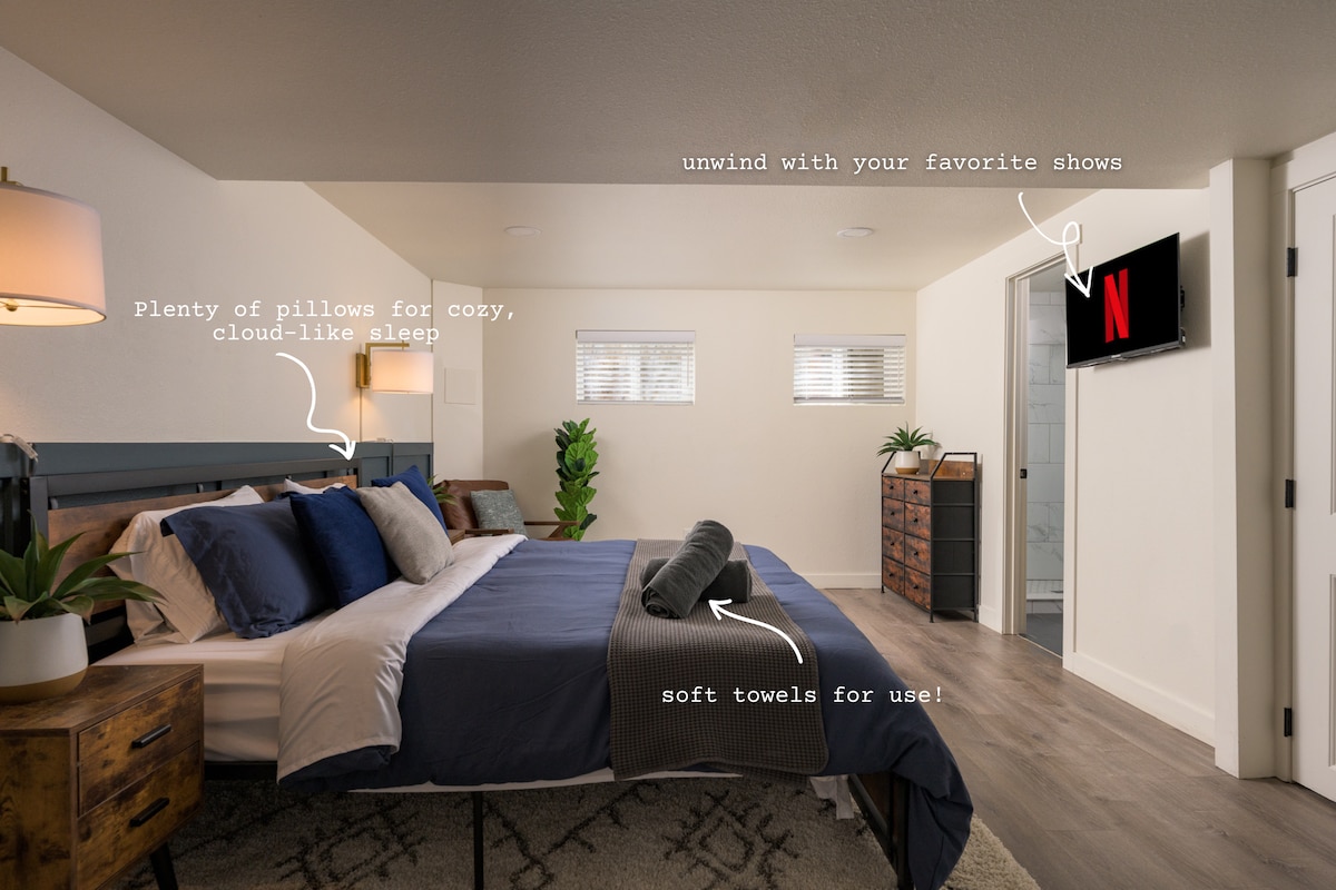 ¡Retiro elegante a nivel de jardín en Denver! Esta unidad con entrada privada es perfecta para parejas, trabajadores remotos o familias pequeñas. Cuenta con una cama tamaño king, espacio de trabajo dedicado, cocina completa y estacionamiento gratuito. A poca distancia en auto de LoHi, RiNo y el centro de la ciudad, lo que lo convierte en la base perfecta para explorar la ciudad. Disfruta de una decoración moderna, WiFi rápido y un ambiente acogedor para tu próxima escapada. “¡Muy limpio y la cama es súper cómoda! También excelente ubicación del vecindario que está a poca distancia en automóvil de todo!" -Nancy