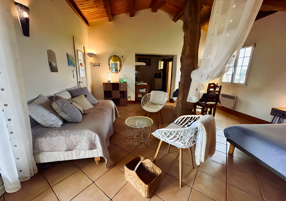 Hola, ofrecemos un estudio de 27 m2 reformado cerca de nuestra casa. Entrada independiente. Aparcamiento privado y seguro. Encontrará lo necesario para pasar una agradable estancia: cocina totalmente equipada, cama de 160, terraza exterior soleada... El estudio está en el corazón de un lugar tranquilo y verde, propicio para la calma y el descanso. El alojamiento se encuentra a 10 kilómetros de la playa de la Palmyre, así como del zoológico y a 20 kilómetros de Royan y de la Isla de Oléron.