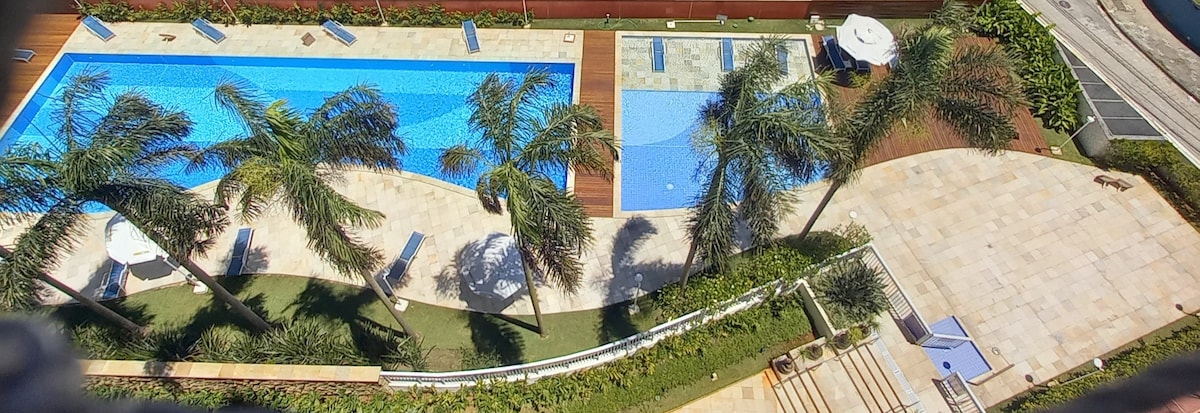 Piso de 65 m2 con vista al mar, 1 dormitorio con cama tamaño queen y aire acondicionado, baño, amplio salón con sofá y ventilador de techo, TV en el salón, cocina pequeña, nevera, cocina, horno, utensilios completos para cocina, lavandería. Tiene colchón extra Servicio de playa, piscina cubierta, sauna, sala de juegos, conexión Wi-Fi gratuita, gimnasio, garaje interior, a 50 m de la mejor parte de la playa de Pitangueiras, junto a Morro do Maluf. Cerca del centro comercial LaPlage y restaurantes.