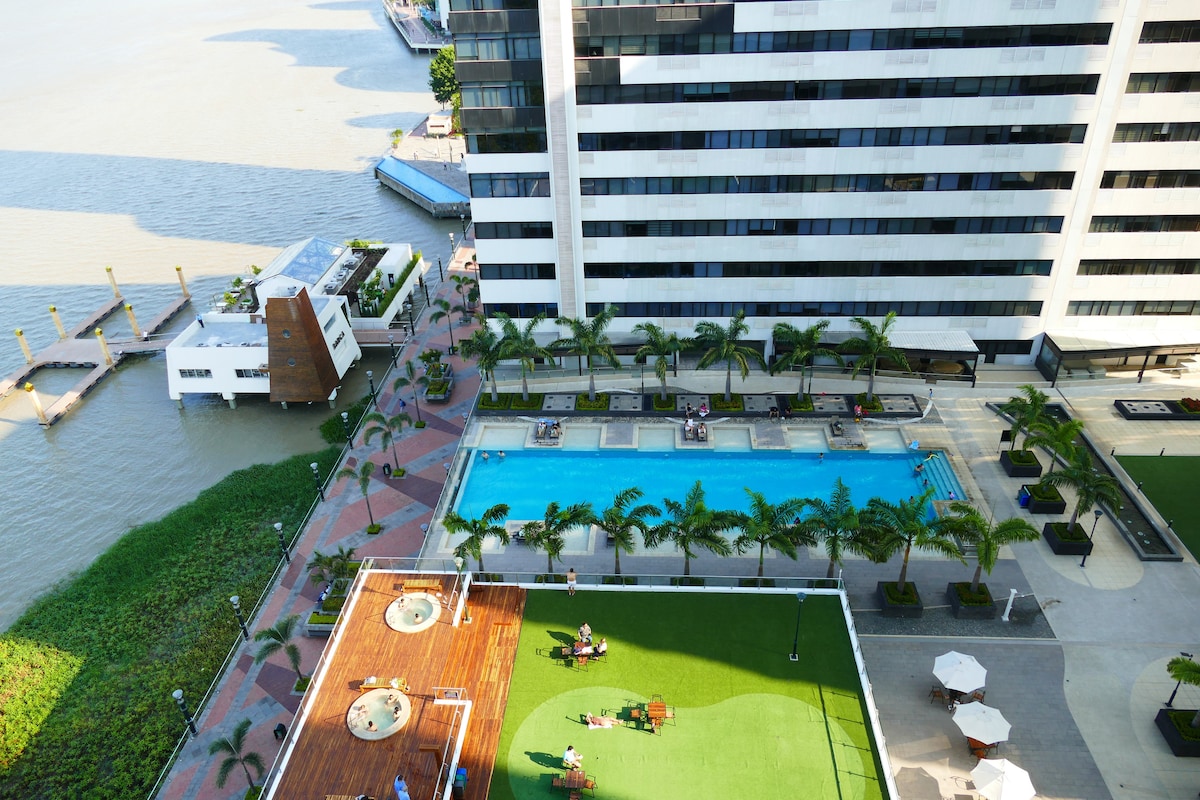 ✅ Hermosa suite en el piso 8 del Edificio River Front #1, con un balcón espectacular y vista panorámica al sector Puerto Santa Ana. 🛏️ Cama King (3 plazas) con sábanas 100 % algodón y sofá cama de 2 plazas, ideal para disfrutar en pareja o familia. 🍳 Cocina equipada, lavadora/secadora, agua caliente, Internet, DirecTV y parqueadero subterráneo. 🏊♂️ El edificio ofrece seguridad 24/7 y amenidades: piscina, jacuzzi, sauna y gimnasio. ✨ A solo 10 minutos del aeropuerto.