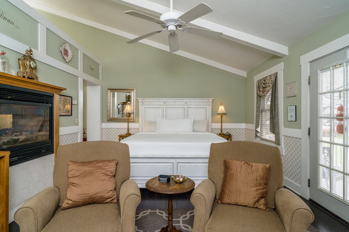 El ladrillo expuesto (ca 1790) crea una encantadora alcoba para la cama tamaño queen y las sillas junto a la chimenea de gas (de temporada). Hay un vestidor separado junto al baño actualizado con bañera de remojo y ducha separada. ¡Las paredes interiores de ladrillo de 15 pulgadas garantizan una estancia acogedora, tranquila y privada! Esta habitación se encuentra en el segundo piso.