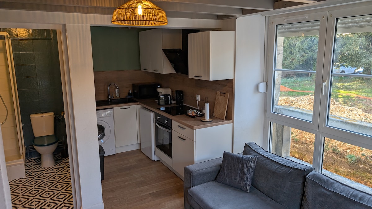 Venga a relajarse en este hermoso apartamento de 50 m2 totalmente diseñado en espacio abierto, baño abierto a la habitación principal. Si lo desea, disfrute de una copa de champaña en una BAÑERA DE HIDROMASAJE y duérmase bajo un cielo estrellado. Disfrute también de la terraza para un pequeño respiro por la noche, o para desayunar frente a la naturaleza. Todo para encontrarse en pareja o en solitario durante una noche tranquila. No dude en ponerse en contacto con nosotros para cualquier consulta.
