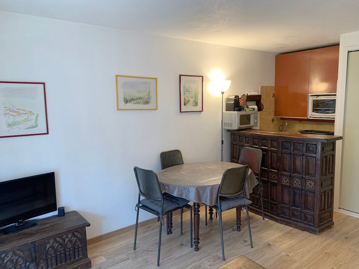 Acogedor apartamento para 4 personas, idealmente ubicado al pie de las pistas. Disfrute de un balcón soleado con vistas excepcionales a la pista principal y a la cordillera de los Pirineos. Zona de noche con cama de 140 cm y sofá cama. Cocina totalmente equipada, TV. Armario de esquís, ascensor, comercios y restaurantes a poca distancia. Ideal para familias y amantes de la naturaleza, tanto en verano como en invierno, para una estadía sencilla, cómoda y exótica. Se puede alquilar ropa de cama y toallas.