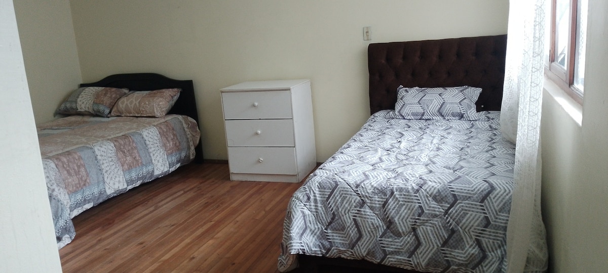 Con excelentes vistas de la Ciudad esta vivienda es lo suficientemente amplia como para que toda tu familia puedan estar juntos, compartir y recordar todas aquellas anécdotas vividas Estamos en una zona tranquila y dentro de una ciudadela a tan solo 7.5 km del Parque Calderon en vehículo harás al rededor de unos 15 minutos de acuerdo al tráfico Con capacidad para 13 personas disponemos de 6 camas y 2 colchones distribuidos en 4 habitaciones. Cuenta con todo lo necesario para disfrutar tu estadía