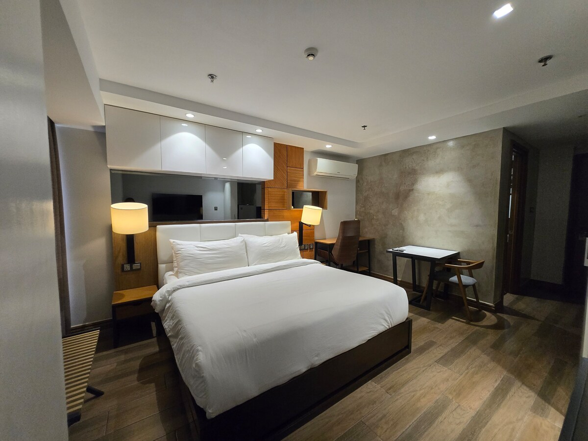 Estudio en el segundo piso con patio sobre la piscina, paquete de Internet ejecutivo, TV Samsung Smart 4K de 55 pulgadas, cocina totalmente equipada con utensilios de cocina, utensilios y cubiertos nuevos. Nueva cafetera de goteo, microondas. Una unidad para no fumadores con balcón con vistas a la zona de la piscina. La Grande Residence se ha convertido en la mejor opción tanto para viajeros de negocios como para turistas que visitan Clark Freeport y la zona de Pampanga. Relájate y desconecta en este alojamiento tranquilo, seguro y elegante.