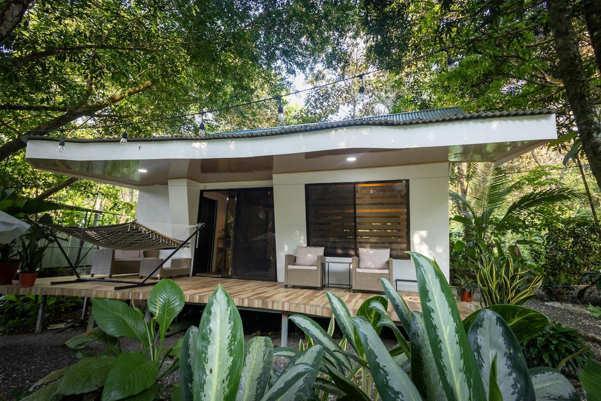 Casa del Bambu: A spacious retreat with a king bed in the bedroom, a twin bed in the living room (another second twin bed upon request), A/C, two smart TVs, high-speed Starlink WiFi, a large bath with a hot shower, and hot water at every faucet. Enjoy cooking in the fully equipped, screened-in semi-outdoor kitchen and unwind on the serene terrace amid lush landscaped gardens, just a 5-minute drive to Puerto Jiménez, close to beaches, restaurants, banks, and amenities.