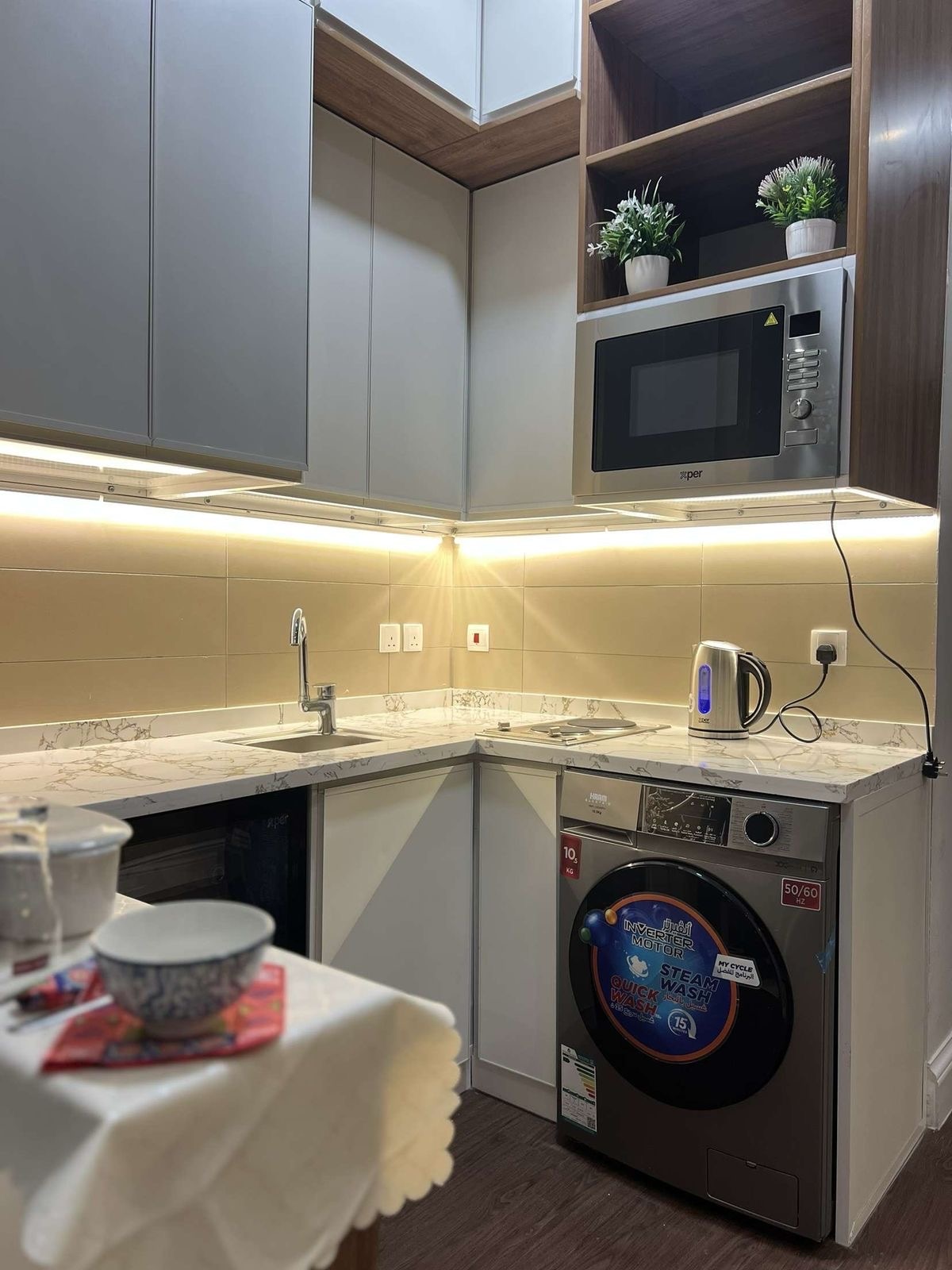 Apartamento de lujo de dos dormitorios con sala de estar, pantalla de 85 pulgadas y cocina