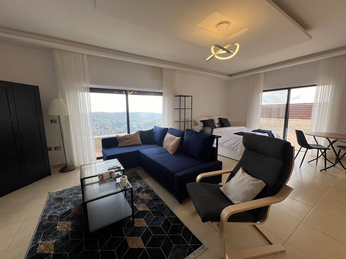 Located under open skies in a prime location in Amman, this one-bedroom rooftop retreat boasts a serene mountain panorama. A cozy spot, featuring a comfortable sofa-bed, blending seamlessly with a well-equipped kitchen. The tranquil ambiance makes it an idyllic haven, inviting moments of calm and relaxation amidst breathtaking views. Enjoy the convenience of nearby markets, dry cleaners, just a few minutes away for the Business Park and City Mall.