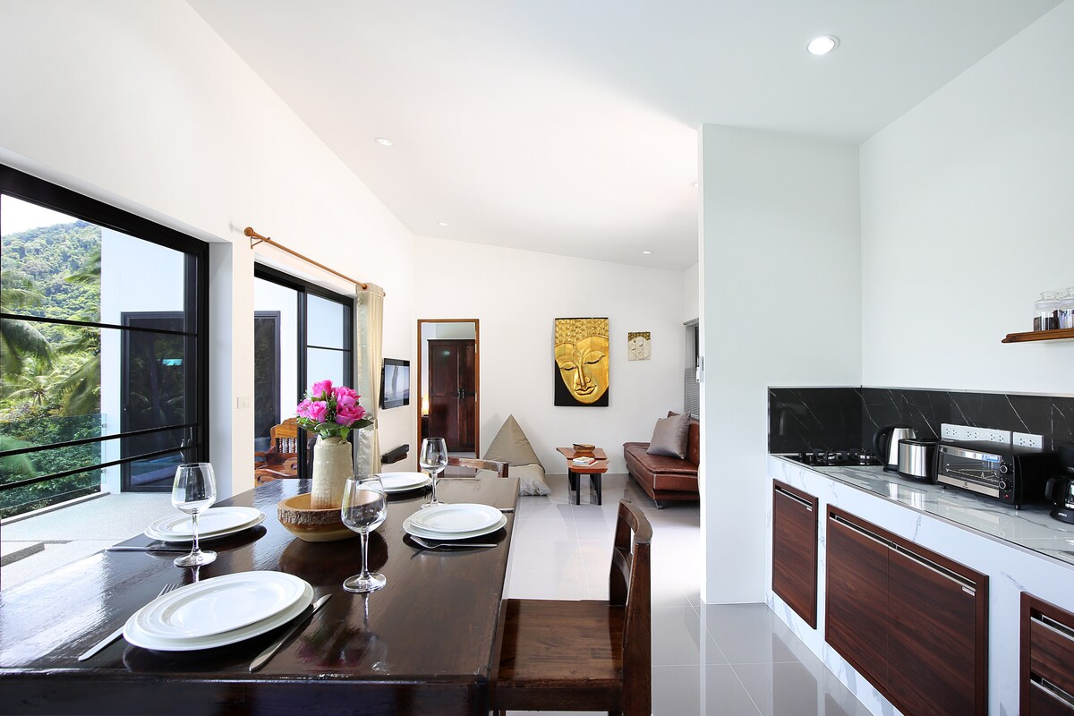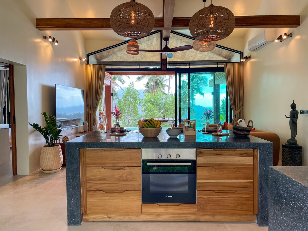 Escápate al paraíso en tu balcón sobre la selva con vistas a la bahía de Hin Kong. Impresionantes vistas desde todos los rincones de esta villa de 2 dormitorios / 3 baños bellamente diseñada. El dormitorio principal de dos niveles tiene techos altos y una bañera con vistas al Parque Marino Nacional Ang Thong. La cocina y la sala de estar se abren al jardín y a la piscina de agua salada. Camas cómodas, sábanas premium esperan tu llegada. Los mejores restaurantes y cafeterías están cerca. Todo lo que necesitas para unas vacaciones perfectas en el paraíso