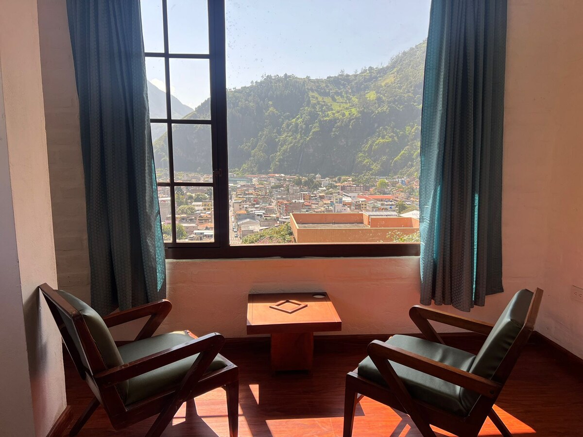 Relájate en nuestra acogedora habitación matrimonial en el corazón de Baños. Disfruta de una vista espectacular a las montañas, a pasos de las aguas termales y la vibrante vida nocturna. ¡Perfecto para parejas aventureras! Habitación privada y cómoda en el centro de Baños. Ideal para descansar después de explorar cascadas y volcanes. ¡Wifi gratis, parqueadero y desayuno incluido!