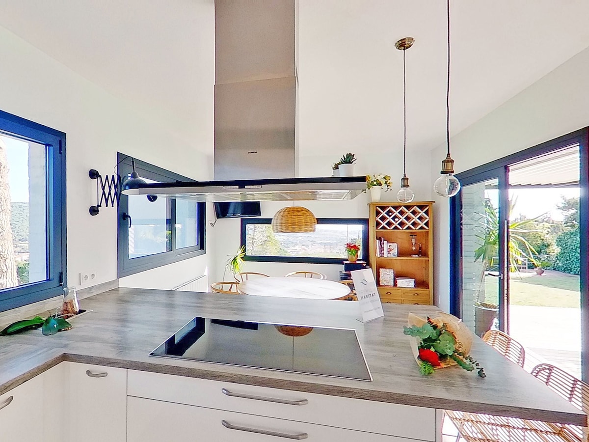 La casa es de dos plantas y tiene siete dormitorios, cuatro baños completos y un aseo. El salón comedor es amplio, a dos niveles, abierto a la terraza principal (60 m2) y comunicado con la cocina por una doble puerta. La piscina no climatizada, utilizable todo el año, tiene 5 x 10 metros. La casa se levanta sobre un terreno de 1,800 metros cuadrados. Cuenta con una casita de madera para juegos y barbacoa exterior de gas. En la planta baja hay una habitación con baño privado.