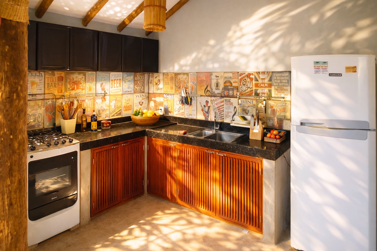 Acogedor bungalow con 1 apartamento (planta baja) con un total de 49 m² de superficie, que incluye: - 1 suite con 2 camas (1 queen y 1 individual) y aire acondicionado - Cocina equipada con nevera, cocina y utensilios. - Cubierta con amplio espacio, sillones y hamacas. - Internet (Wi-Fi) de alta velocidad disponible para home-office - Tanque de lavandería Ubicación privilegiada (a menos de 150 metros de la playa y a 300 metros del pueblo de Barra Grande). Zona exterior con jardín, espacio para hamacas y ducha de playa.