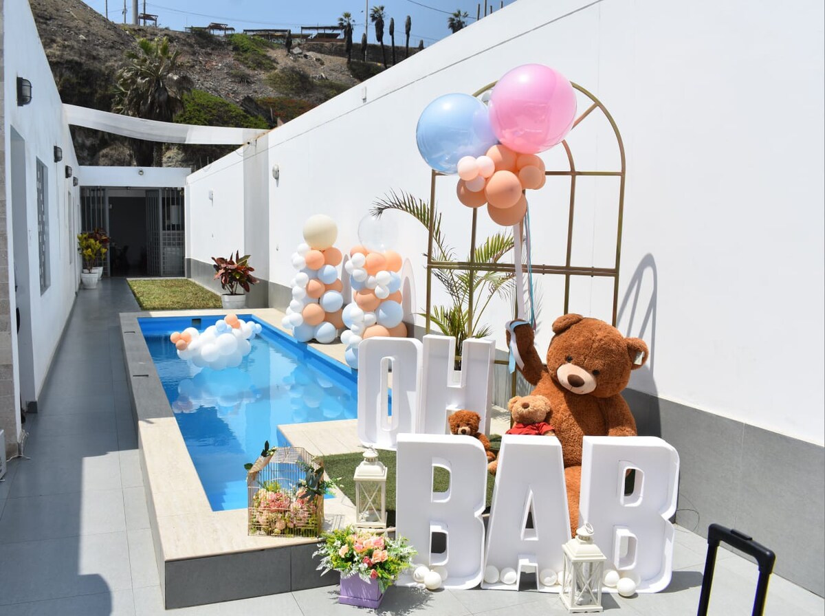 Casita con todas las comodidades, con piscina, áreas verdes y terraza para ver el hermoso sunset de la costa peruana y pasar unos días de relax con la familia o con amigos. Rodeada de tranquilidad pero cerca a todo lo necesario, a tan solo 9 minutos del centro de la ciudad de Barranca, supermercados como Metro y Plaza vea y de las playas. Nuestra casa Barranquita es Pet friendly y con una casa para gatitos.
