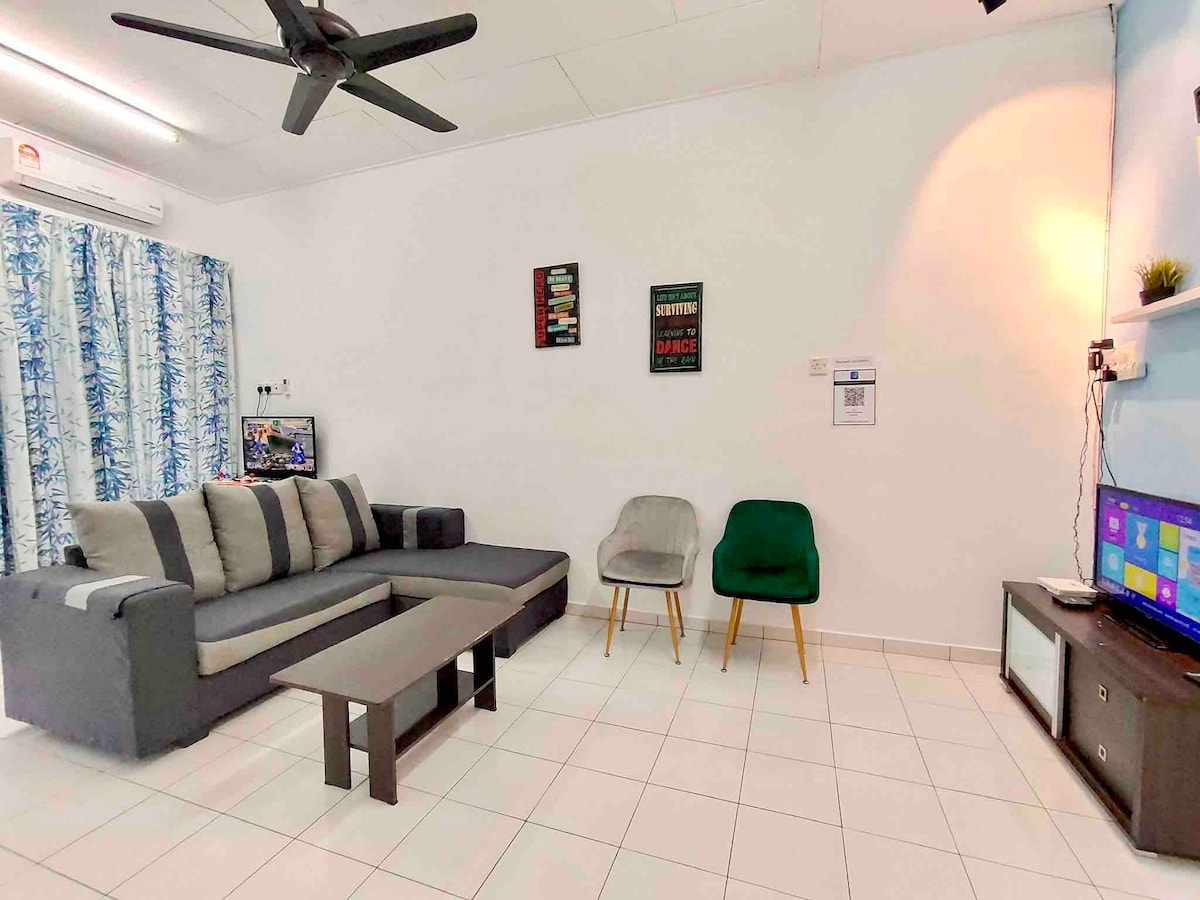 Ubicado en Taman Mahsuri Jaya, a aproximadamente 1 km de UTAR, rodeado de muchos restaurantes y cafeterías como Starbucks, Sushi Mentai, Ally, McDonald's 24 horas, etc. Ubicación muy conveniente. Tenemos colchones cómodos de 11 pulgadas y un interior acogedor. Ropa de cama estándar para 8 personas; se pueden añadir colchones de suelo para hasta 12 personas con cargo adicional