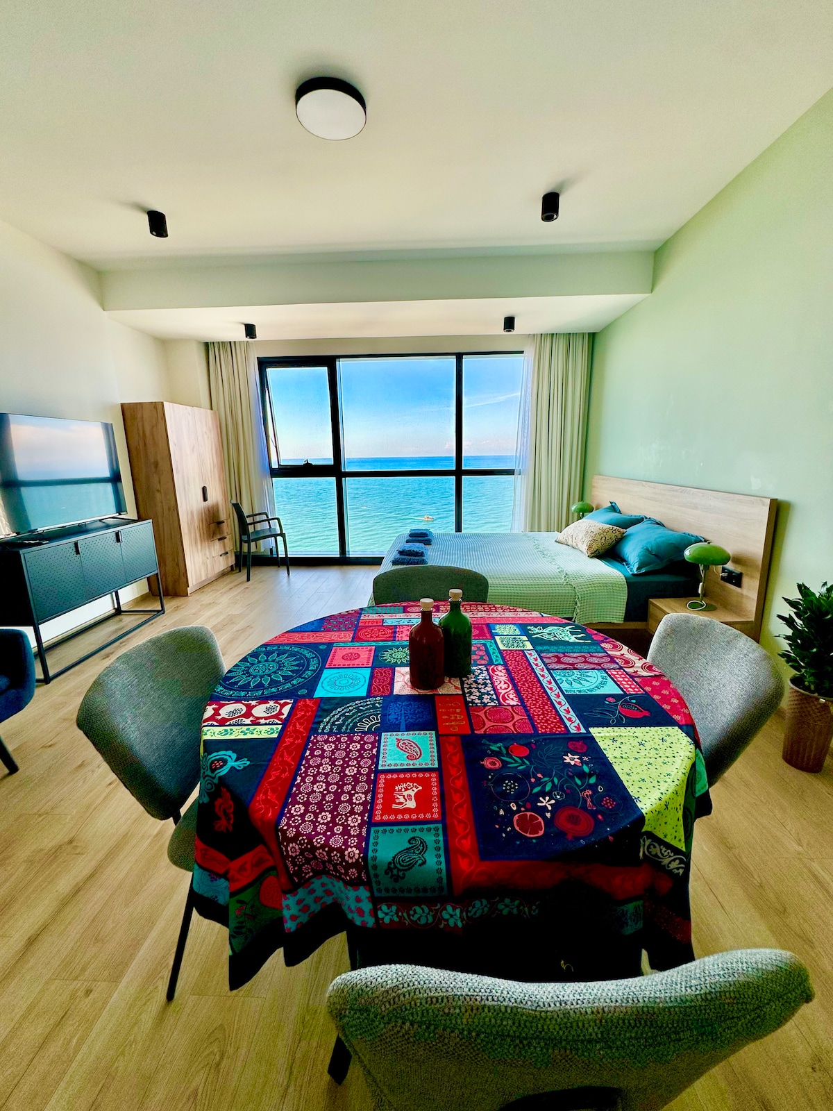 Nuestras instalaciones están decoradas con colores sencillos y elegantes. Cuenta con todo lo necesario para vivir y está situado en el centro de la ciudad. Ofrecemos no solo vistas al mar, sino también a la ciudad, al lago y a la montaña. Al mismo tiempo, nuestros huéspedes tienen la oportunidad de degustar delicias locales de forma gratuita, como el delicioso vino georgiano, el queso y el postre. Nuestras instalaciones son nuevas y tendremos sorpresas especiales para nuestros primeros huéspedes.