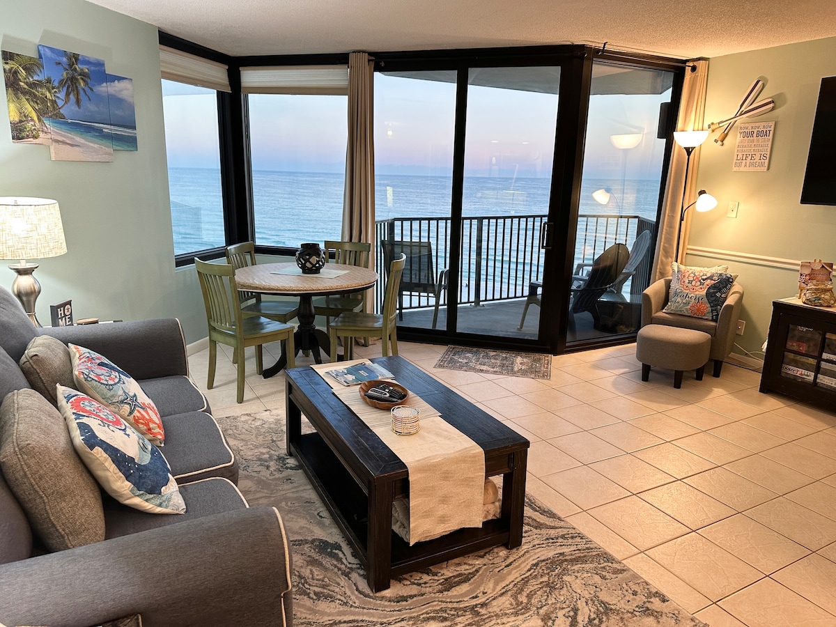 ¡🌴 Tu escapada a la playa te espera! DEBES tener más de 25 años para reservar (regla de la Asociación de Propietarios). Frente a✨ la playa ✨ - 2 sillas de playa, carrito de playa, sombrilla incluida - 2 mecedoras para balcón - 1 cama tamaño king, 1 sofá cama tamaño queen. - Wifi gratuito (alta velocidad). - 3 piscinas al aire libre. - 2 canchas de pickleball - Estación de café. - Cocina completa. - 2 televisores inteligentes (DirecTV/cable/streaming) - 2 zonas de parrilla al aire libre - Gimnasio - Tazas de recuerdo de Pineapple Willy's: ¡descuentos en daiquiris incluidos! 🍹 ¡Este tranquilo refugio ofrece la mejor escapada a la playa!