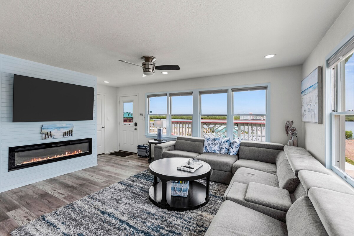 Acogedora casa de 3 dormitorios y 2 baños, con una ocupación máxima de 7 personas. ¡La casa está recién remodelada y tiene todo lo necesario para pasar unas vacaciones familiares perfectas! Pasa el día explorando las atracciones cercanas, pescando desde el patio delantero o simplemente disfrutando de las hermosas vistas desde tu terraza privada arriba y abajo. La casa se encuentra a 13 minutos de The Strand en Galveston, a 24 minutos del dique de la ciudad de Texas y a 30 minutos de Kemah. Solo se puede acceder a la casa por escaleras, no se admiten mascotas.