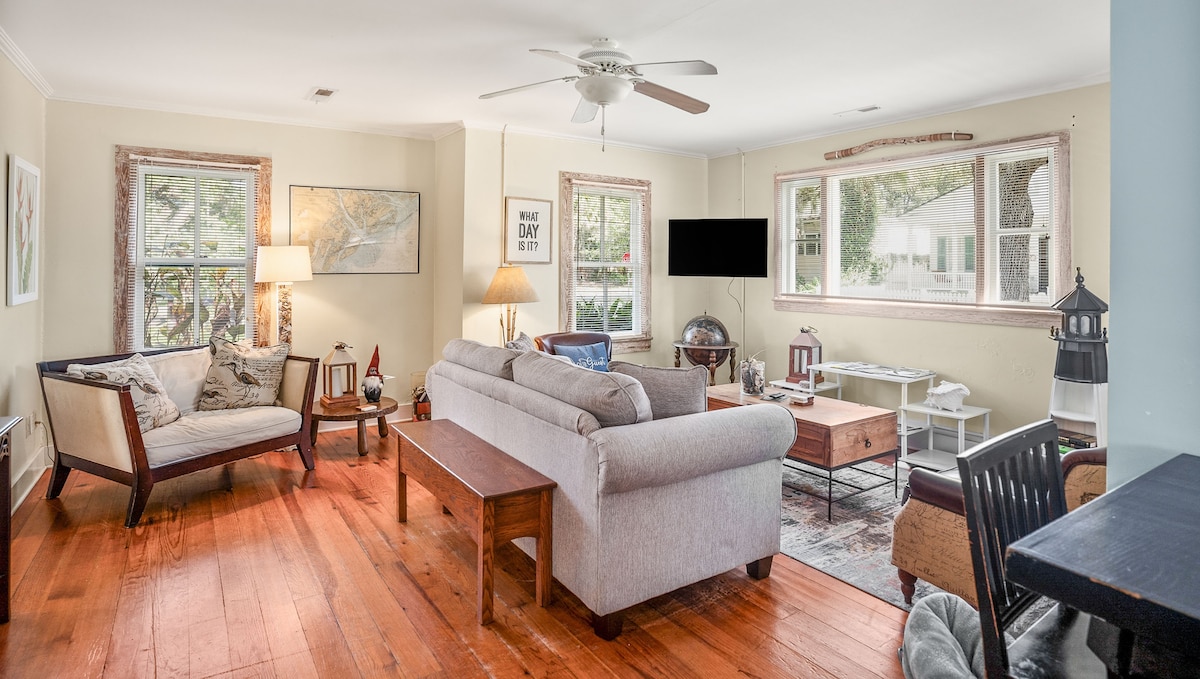 A pocos pasos del próspero paseo marítimo de Beaufort y a poca distancia en coche de los restaurantes, tiendas, distrito de arte y el sendero Spanish Moss Trail del centro de la ciudad, nuestra acogedora casa de campo llena de luz está diseñada pensando en tu comodidad y relajación. En el corazón del distrito histórico, disfruta de un café en la terraza trasera, relájate junto a la chimenea o simplemente relájate en el interior: es el lugar perfecto para llamar hogar después de explorar las playas/parques de SC con nuestro pase de playa de cortesía. ¡Ideal para familias, parejas y grupos pequeños!