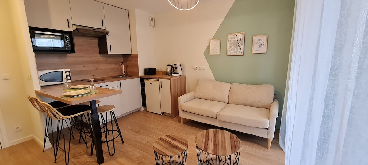 Estudio de 17m2, bien organizado para optimizar el espacio y muy cómodo. La entrada es independiente y se hace a través de una escalera exterior. Lo hemos equipado totalmente para que no tenga más que instalarse. Encontrará una cama real de 140x190 para dormir y un sofá no convertible para ver la televisión . Hay una cocina equipada si desea prepararse una comida o puede elegir un restaurante en la zona. Algunos ofrecen entrega.