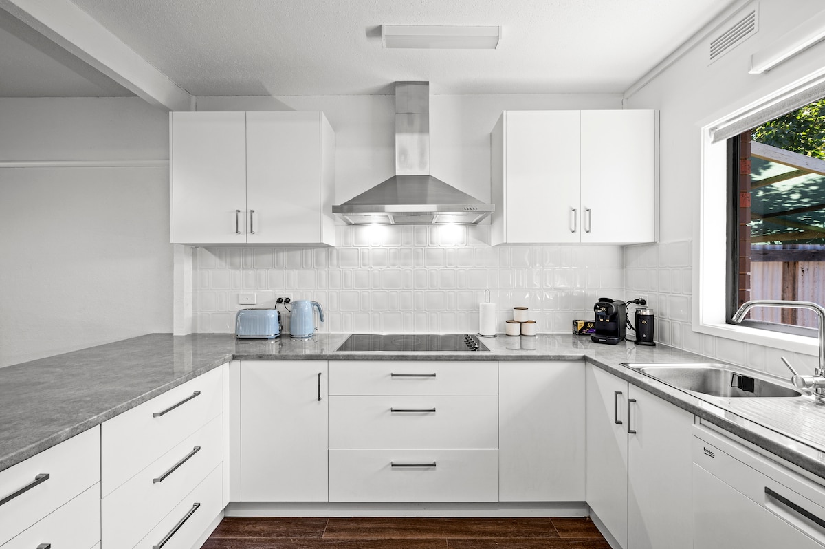 Granja Casa moderna casi nueva con ambiente rural, capacidad para 6 personas cómodamente. 3 dormitorios, 1 baño con ducha, 2 aseos, 2 salas de estar con TV inteligente de 65 pulgadas, cocina totalmente equipada y lavandería, garaje para 3 coches. Asientos al aire libre y zona de barbacoa. A 5 minutos en coche del lago y la ciudad de Benalla, a 7 km de la pista de carreras de Winton y de Winton Wet Lands. Tiene espacio para aparcar coches y remolques para las personas que compiten en Winton. O, para un ritmo más lento, puedes ver crecer la hierba en nuestra granja de ganado y ovejas.