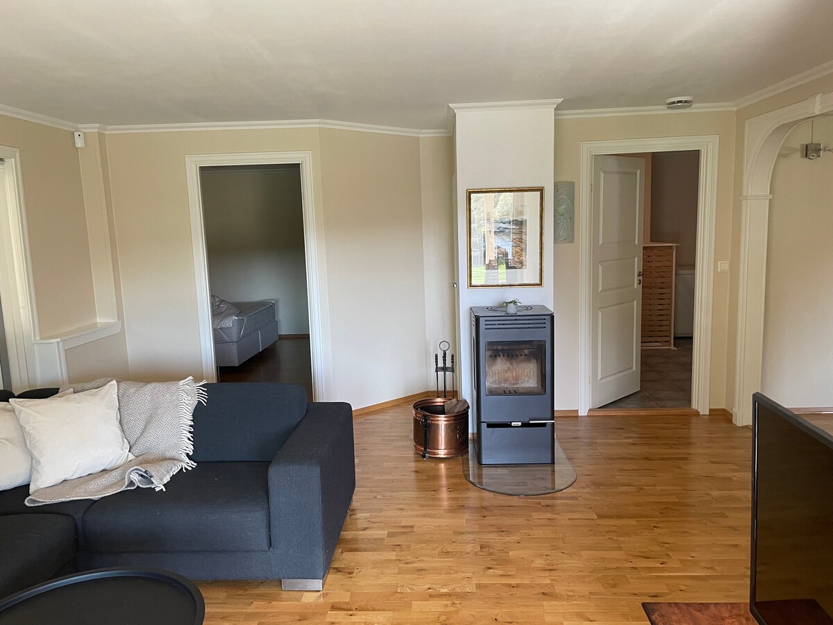 Relájate con toda la familia en este tranquilo refugio. Amplia casa unifamiliar de 250 metros cuadrados (construida en 2015) con una ubicación única de verano junto al lago. Hay una tabla de SUP y una sauna privada disponibles. La gran área al aire libre cuenta con un amplio césped, trampolín, mesa de jardín, parrilla de gas y dos sofás al aire libre, perfectos para relajarse y disfrutar de largos días de verano. La casa tiene dos pisos e incluye 4 dormitorios grandes, una acogedora sala de estar en el sótano. A solo 20 minutos en auto del centro de Bergen