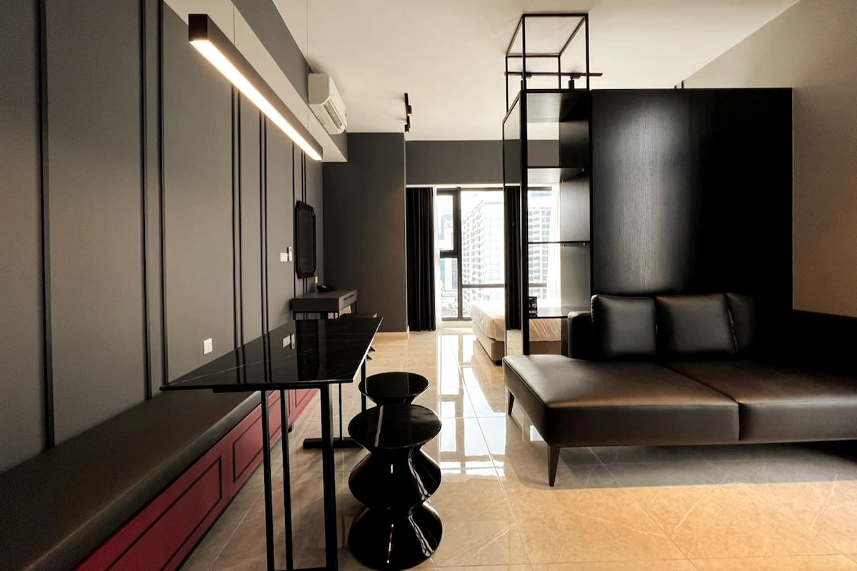 Este apartamento de 1 dormitorio cuenta con una vista impresionante del horizonte de KL. Cuenta con un salón con sofá de 3 plazas, mesa de comedor, cocina, escritorio y un gran balcón frente a la Torre KL y las Torres Petronas. Viene con TV de 55 pulgadas, wifi de alta velocidad y una cama tamaño queen en la que puedes acomodarte cómodamente. *La otra unidad de este apartamento de llave doble es un estudio compacto con cama tamaño queen, despensa, baño y bañera. Pueden caber amigos que viajan contigo con privacidad. ¡Te invitamos a solicitar más información!