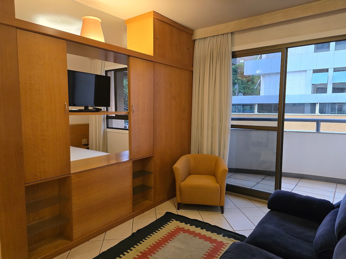 O Flat fica no mesmo prédio do Hotel Piemonte. Apartamento com uma suíte ampla e integrada com sala de estar e cozinha americana. O apartamento fica no 6° andar, possui elevador, portaria 24 horas e estacionamento incluído. Muito próximo à Alameda Oscar Niemeyer com acesso fácil ao comércio, restaurantes, bares, lojas, supermercados e farmácias.