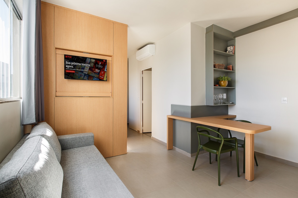 Apartamento moderno, 32m2, localizado no melhor ponto do Sion. Cozinha prática com frigobar, cooktop, TV (canais abertos/Netflix), ar condicionado, secador de cabelo, chaleira elétrica e internet. Zona Sul, ao lado da Praça JK e Avenida Bandeirantes, em frente a um Supermercado. Rooftop do prédio com academia, sauna, piscina, área de convivência e cozinha comunitária (água, máquina de gelo). Limpezas sob demanda disponíveis. Prédio seguro com portaria 24h. *Não há garagem inclusa.