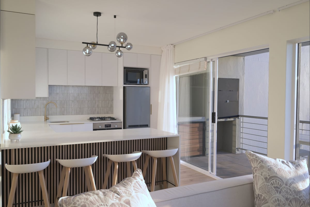 Breathe in the fresh ocean air from this chic getaway. The residence features an open concept main space, a monochromatic interior, a stripped-down design aesthetic, and sliding glass doors leading onto the terrace. Enjoy the beautiful views of the ocean and Table Mountain. Smart tv where you can log into your Netflix account. WiFi 2 parking bays and storage. Closed combustion fireplace with panoramic window and thermo fan quickly heats the entire apartment to a cosy home. We have a nutribullet for your healthy morning smoothies on the terrace. Walking distance to the beach Large private balcony with bbq facilities. We have two underground parking bays as well as a garage for kite boarders to store their gear. Open plan kitchen and living area. Separate bathroom and bedroom. The living area and bedroom both open up onto the spacious balcony. The apartment is located within walking distance of the beach, and close proximity of the best restaurants, cafes, shops Cape Town has to offer.