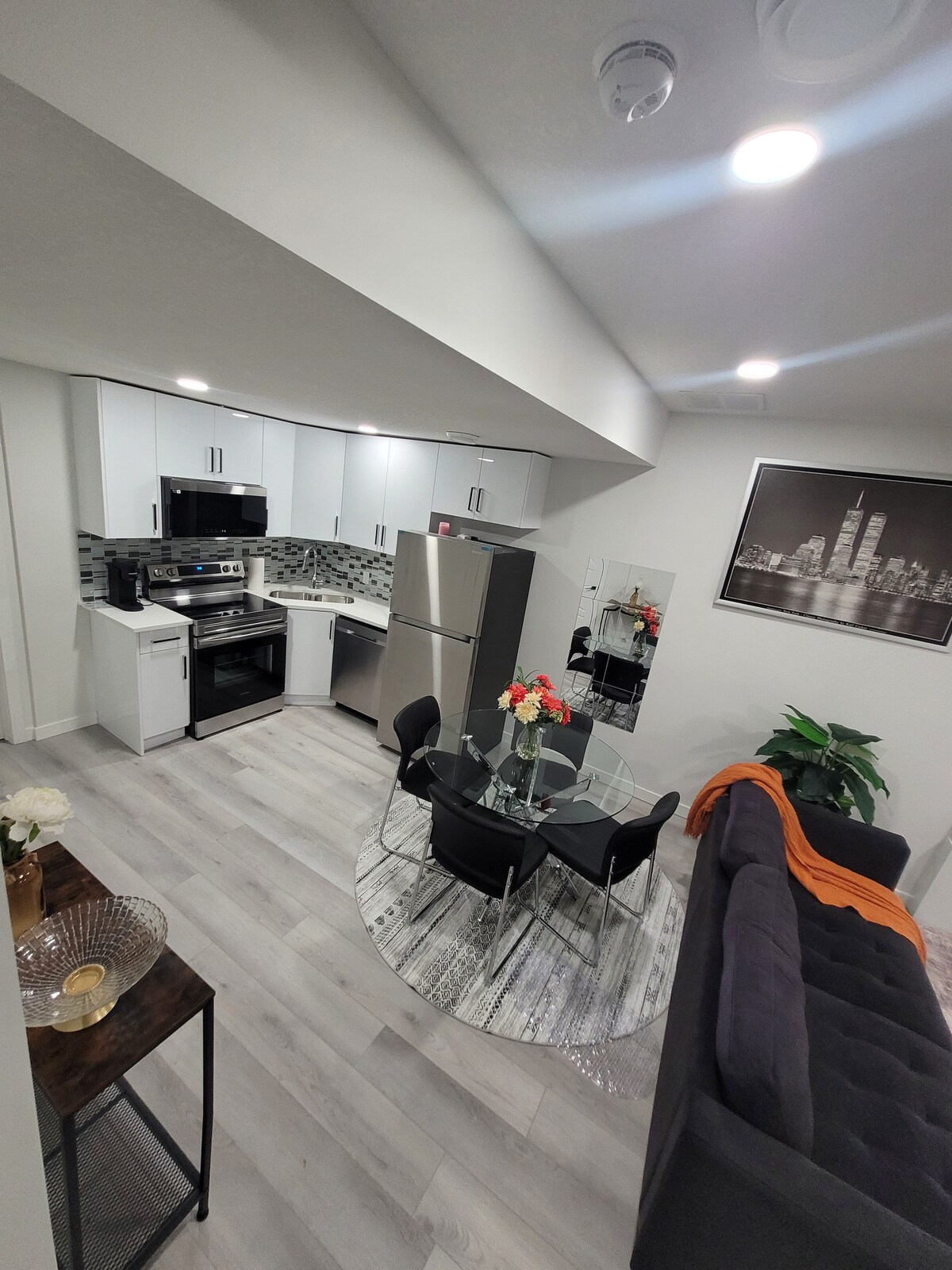 Our newly-renovated and romantic NYC loft-inspired basement suite offers over 1000 square feet of luxurious living space. With its high ceilings, floor-to-ceiling glass walls and French doors, and cozy in-floor heating, you'll feel like you're in a real loft. The high-end kitchen and bathroom add a touch of sophistication, and the 90s Simpsons arcade game provides hours of entertainment. Book your stay with us and experience the luxury and comfort of our suite.