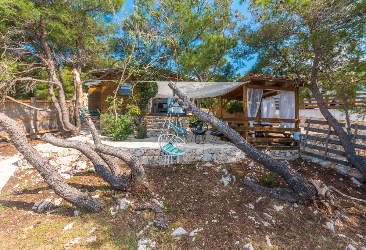 IMPORTANTE: selecciona tu período: los asistentes al festival (thegardencroatia .com/eventos) o familias. 1 noche GRATIS para estancias demás de 14 días Moderno (2023) y elegante bungalow, con todos los servicios y estacionamiento. Vista directa al mar desde la amplia terraza escondida entre olivos y robles. Playa aislada, en una bahía al borde de las islas Kornati. Zona tranquila y silenciosa, perfecta para grupos que quieren relajarse y despejar. Atracciones cercanas en auto. Perfecto para grupos de 4, con 2 dormitorios y baños.