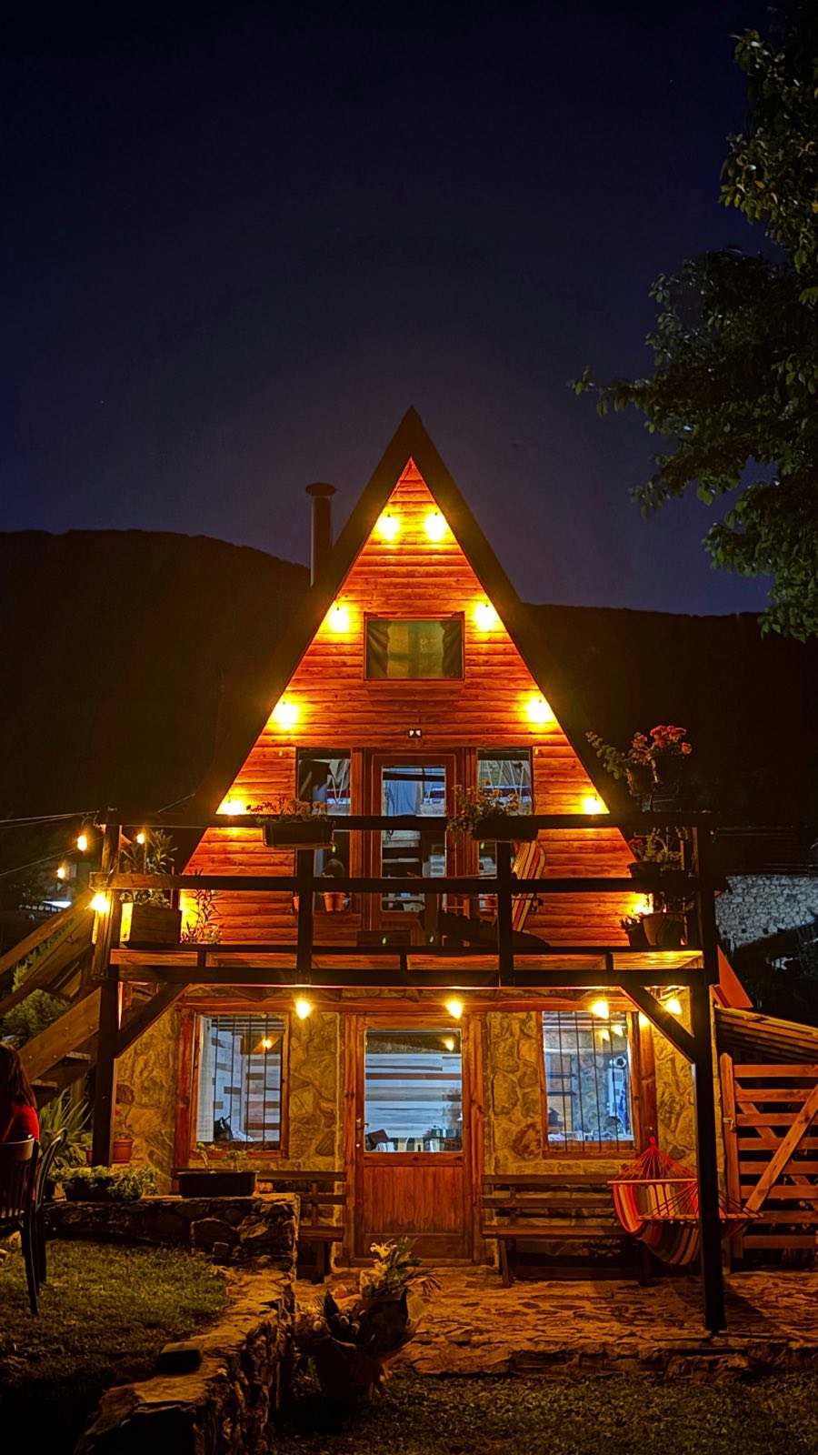 Cozy A-Frame Mountain Cabin with Stunning Nature Views Escape to this charming A-frame wooden cabin nestled in the peaceful mountains — the perfect getaway for nature lovers and adventure seekers. The cabin features a warm and rustic design with natural wood and stone elements, offering a cozy atmosphere both inside and out. Enjoy your morning coffee or evening wine on the sunny wooden terrace with panoramic mountain views