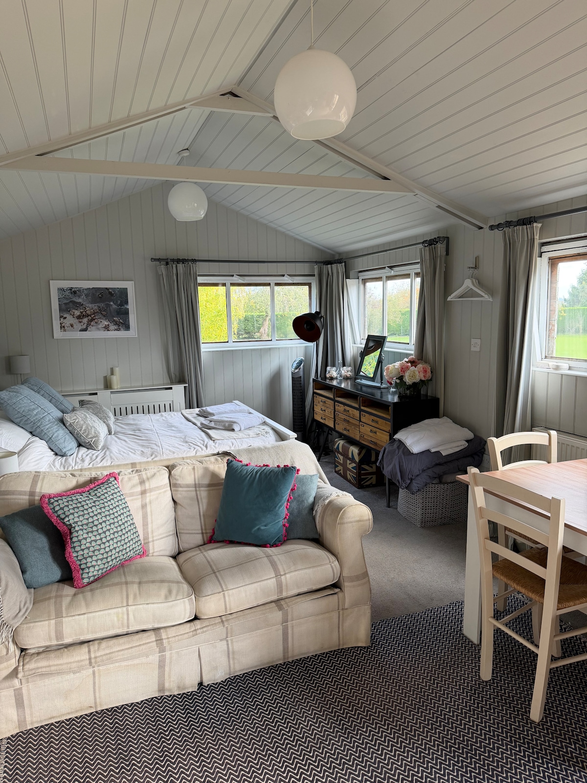 Un estudio independiente con entrada privada propia, excelentes vistas a las colinas de Wiltshire y al caballo blanco de Cherill. Una cama tamaño súper king o 2 camas individuales si se solicita. Hay un baño privado y una pequeña alcoba con utensilios para preparar té y café, cafetera Nespresso, nevera pequeña y horno microondas (no es una cocina adecuada). ¡Pan casero o cruasanes por la mañana! Wifi. Registro de entrada autónomo.