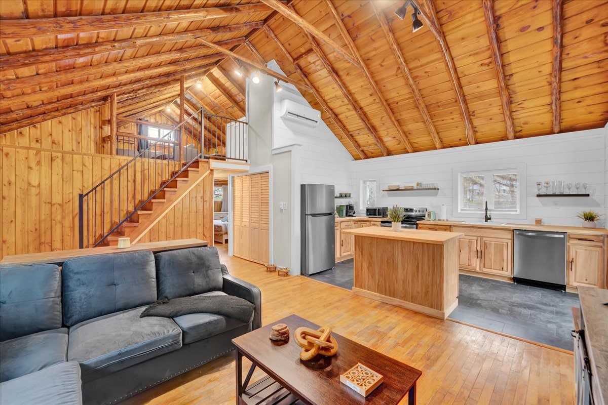 Si buscas una escapada o aventura tranquila e íntima, ¡este es el lugar ideal! Entra en esta exclusiva cabaña de troncos con toda la estética de Pocono que puedas desear. Relájate y recarga energías en la cocina y el salón de pino nudoso de concepto abierto. El loft abovedado ofrece una sensación abierta y espaciosa. Los dormitorios cuentan con camas nuevas y armarios grandes. La cocina está bien equipada y la sala de estar cuenta con chimenea de leña, TV Roku, dos sofás, una colección de DVD, Nintendo 64 y juegos de mesa.