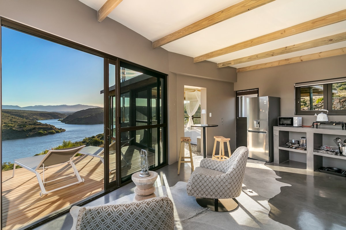 Refugio romántico privado en Karoo, en la Ruta 62 | Jacuzzi y aislamiento total | Llegada en bote Ustedes son los únicos huéspedes. Un refugio 100 % privado en Little Karoo, accesible solo en barco. Sumérgete en tu bañera de hidromasaje privada de leña, observa cómo las montañas se vuelven doradas al atardecer y vuelve a conectarte bajo algunos de los cielos nocturnos más claros de Sudáfrica. Sin vecinos. Sin espacios compartidos. Solo montañas, agua, vida silvestre y silencio.
