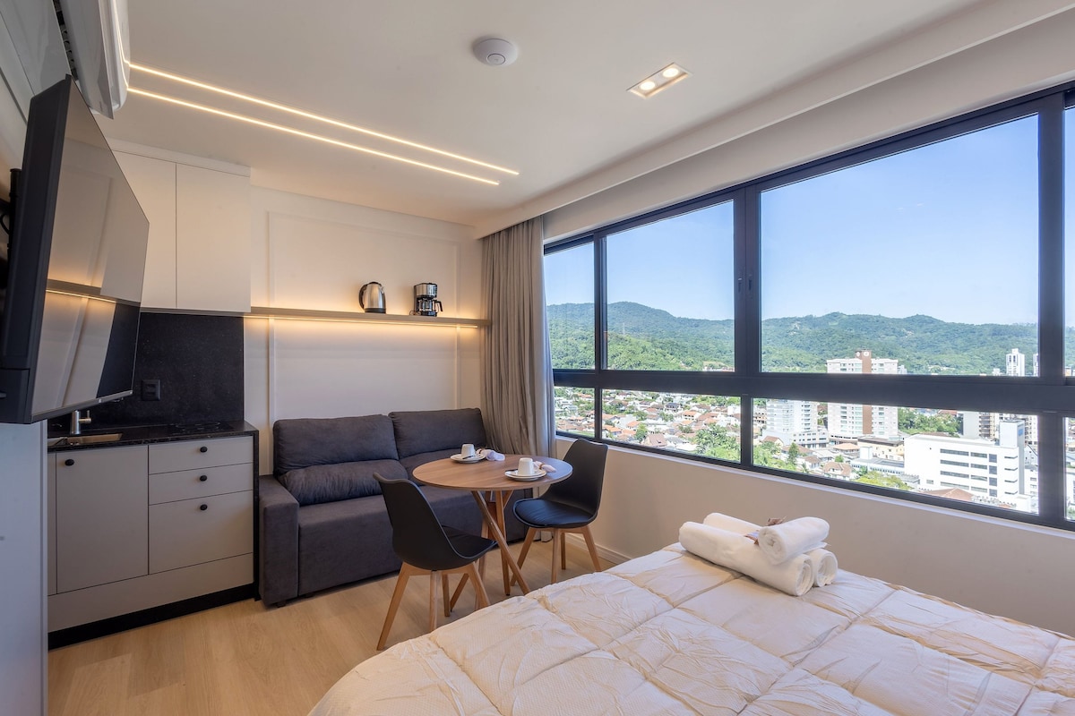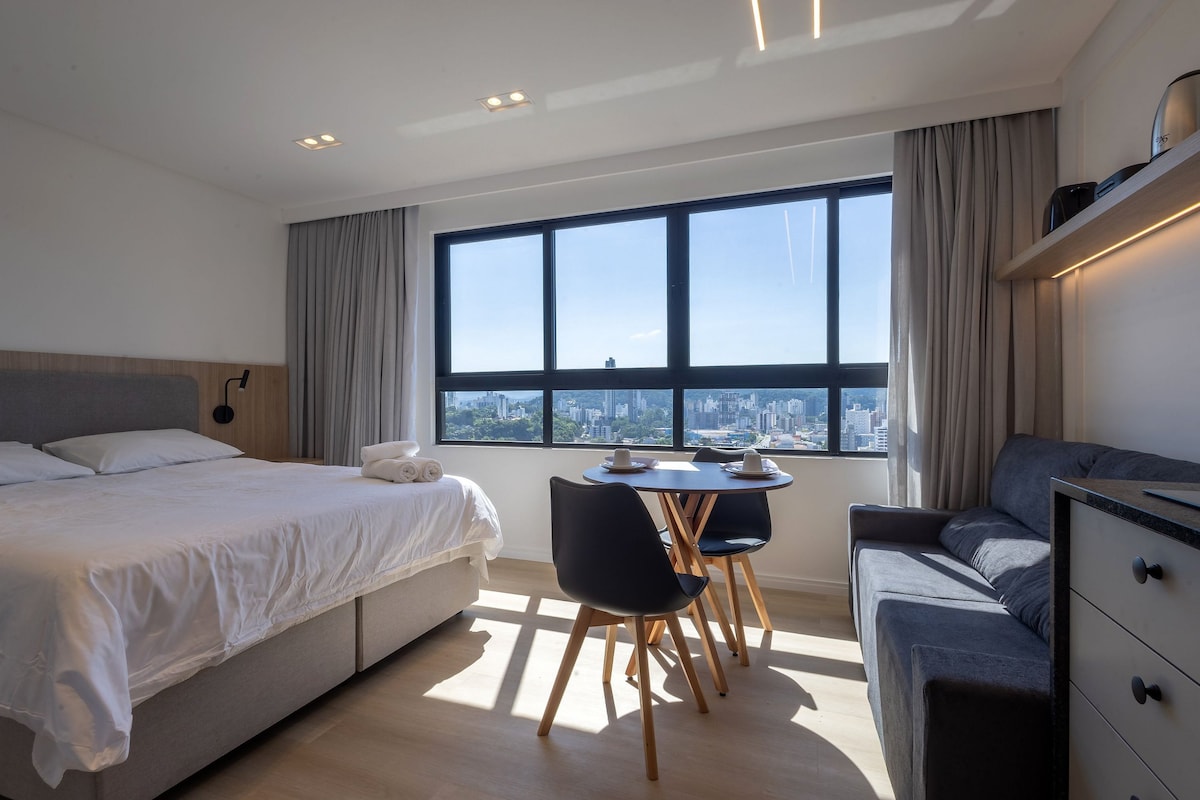 Sofisticado apartamento tipo estudio ubicado a 800 metros del parque Vila Germânica, lugar de eventos como el Oktoberfest. Rodeado de restaurantes, bares y supermercados. Todo para su comodidad: Smart TV 50" Samsung, aire acondicionado split, ducha de gas, wifi fibra 240mb, cocina completa con heladera Brastemp, microondas, horno, estufa, campana extractora, cafetera, purificador de agua, lava y seca, armarios, y por supuesto ¡una cama queen con el mejor colchón!