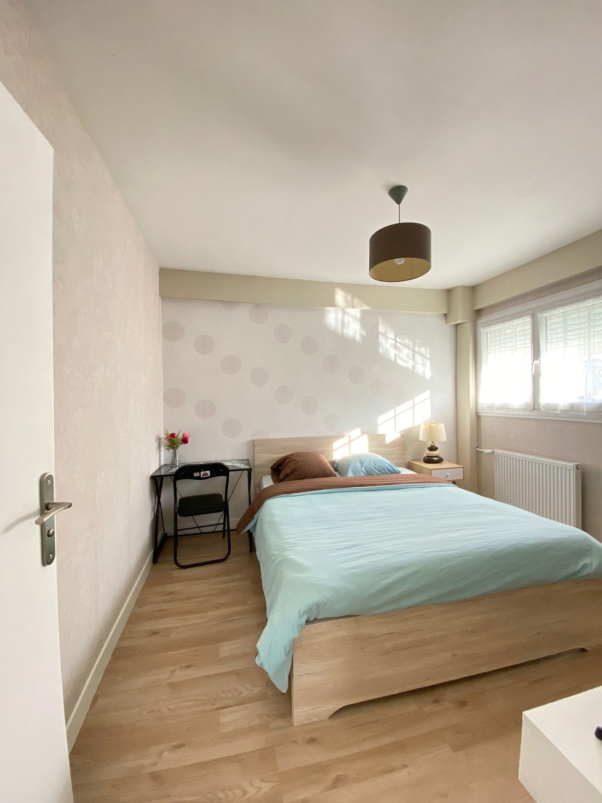 Pequeño apartamento con un dormitorio grande (25 m2). Entrada independiente situada en la planta baja. Equipado con una cama de 160 x200 cm, un armario, un escritorio, un lavabo (además de la ducha), SmartTV y wifi. Se proporcionan sábanas y toallas. Cocina independiente con placa de inducción, microondas, nevera, hervidor de agua, cafetera Senseo, té , infusiones, pequeñas mermeladas y golosinas. Baño e inodoro privados. Acceso privado a una pequeña terraza.