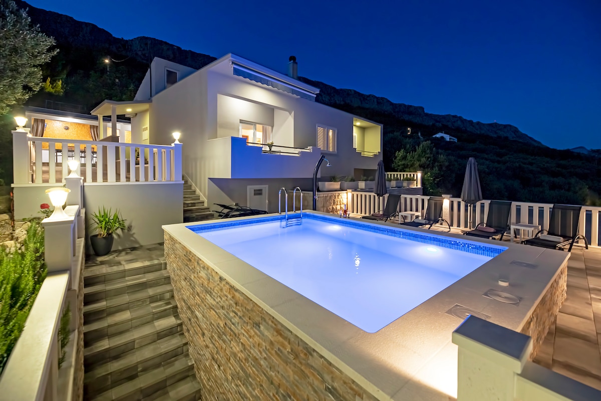 Our brand new luxury villa Luka is located on a wonderful location with beautiful sights and yet still very close to the all local points of interest. The villa is newly built for maximum comfort and luxury with 3 ensuite bedrooms (and an extra room in case of need) and all other amenities you can need. A big private, heated pool with wonderful views, great indoor jacuzzi in spa area with an sauna and gaming/billiard room, a nice fenced outdoor area with a table tennis, badminton or archery set.