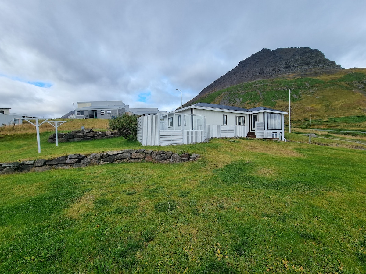 La casa es pequeña, acogedora y acogedora con solárium y una vista a la parrilla. Nida en un amplio jardín cerca del mar y el puerto del pequeño pueblo pesquero de Bolungarvík Witch está rodeado de montañas en tres lados. La casa está en 2 plantas, en la planta baja hay una cocina abierta, sala de estar con sofá y baño con ducha. El segundo piso es un loft para dormir con 1 cama doble, una cuna de viaje está disponible bajo petición.