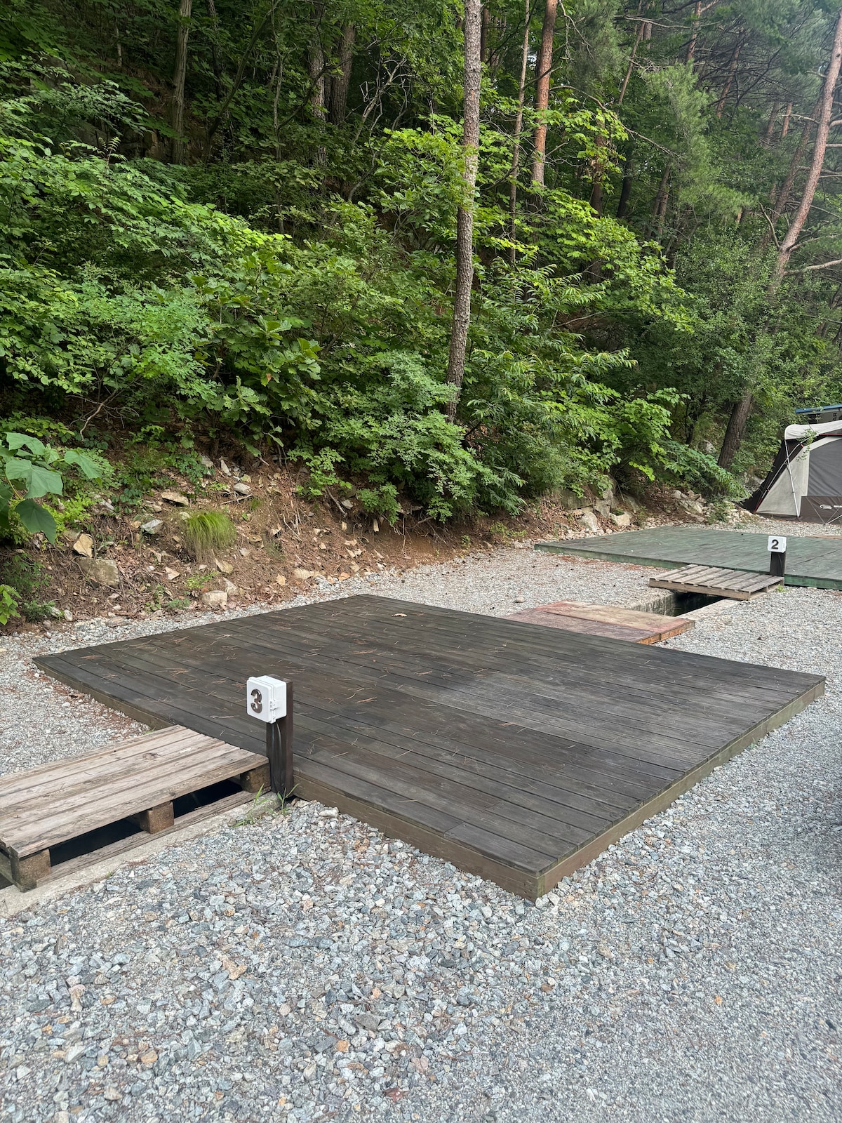 Ubicado justo enfrente del Valle del Río Salado en el Parque Nacional Odaesan, es un espacio de dos pisos donde puedes sentir la sensibilidad de acampada con el juego de agua en el valle. Tiene 40 pyeong, incluida la terraza, y la tienda de campaña tiene capacidad para 7-10 personas. (Tenemos un Polaris Taurus para 5-7 personas y un Taikan para 3-5 personas). El primer piso está a cargo de un restaurante local y ofrecemos un 10% de descuento en comidas con servicio de habitaciones cuando usamos el lugar en el segundo piso. Hay una piscina pequeña en la terraza, puedes comer en el interior y cocinar comidas sencillas, y hay una tienda a tu lado, por lo que puedes comprar cómodamente los artículos necesarios. Experimenta la cima de la curación natural con el juego de agua en el valle cristalino de la montaña Odaesan.