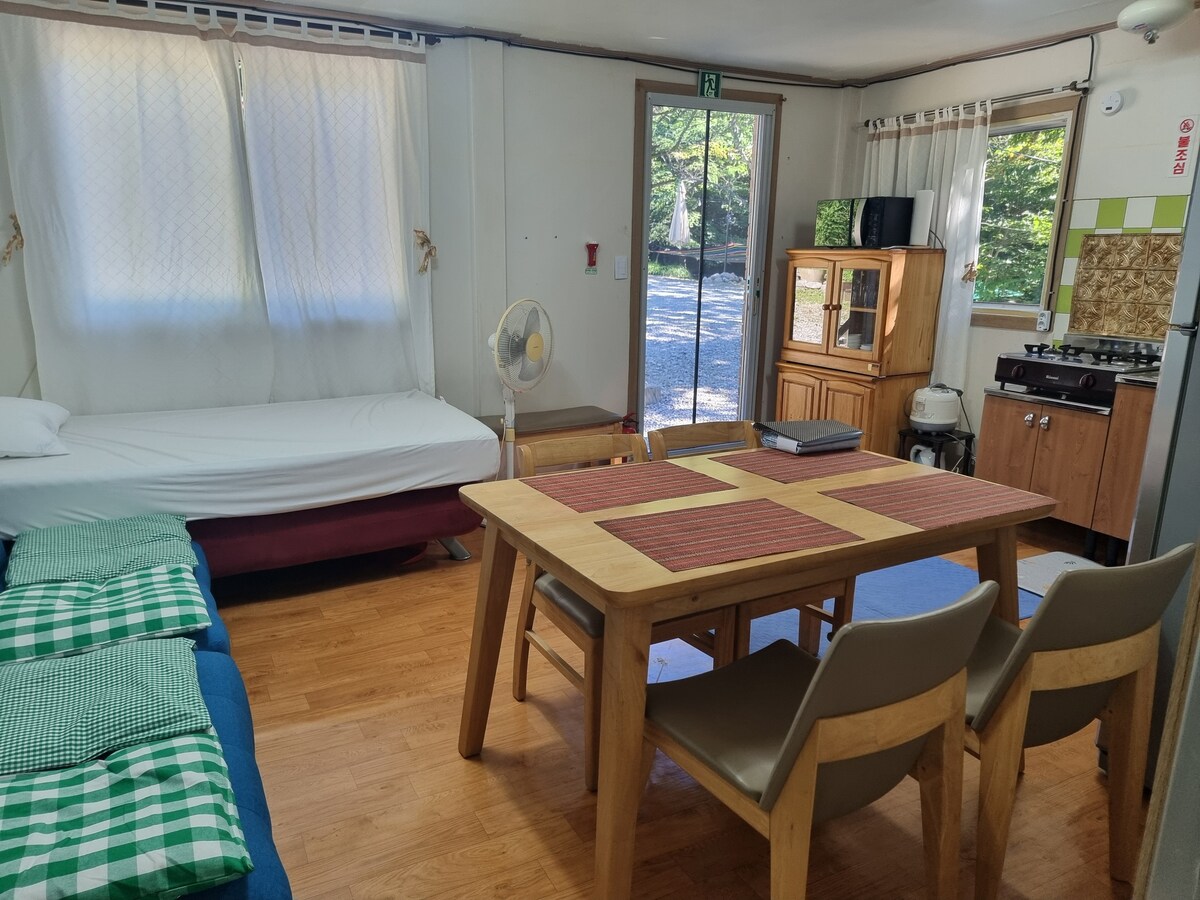Es un espacio donde se puede disfrutar tranquilamente de la curación en la naturaleza, y es un pequeño edificio separado que consta de un piso doble frente al valle. El interior es pequeño, pero el patio y el sitio son espaciosos, por lo que puedes moverte libremente, y también hay un espacio de barbacoa separado. Tiene capacidad para un mínimo de 2 personas y un máximo de 4 personas. En verano, también puedes pintar carpas en el patio o el valle, y hay un valle frente a la casa, que es bueno para jugar en el agua, y puedes ver el magnífico paisaje de Odaesan durante todo el año. La barbacoa está equipada con parrilla y linterna, y puedes comprar tu propio carbón vegetal y usarlo tú mismo. Alarma de humo del extintor Hay una alarma de fuga de gas. Se proporcionan refrigerador, inducción, microondas, cafetera, secadora, aire acondicionado, ventilador, olla, sartén, utensilios, toallas, champú, jabón, etc.