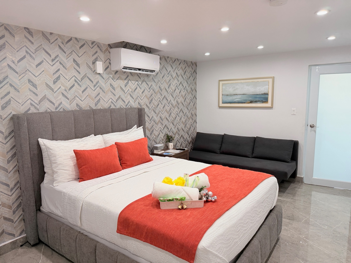 Este hermoso lugar tiene una cocina-sala de estar, un dormitorio con baño, Walking closet, la sala de estar cuenta con un televisor / Roku para su entretenimiento, muy cómodo para aquellos que desean pasar unas maravillosas vacaciones en Puerto Rico. Ubicado en un área central: Aeropuerto (5 min) Farmacia (2 min) Supermercado (2 minutos) Isla Verde (6 min) Alquiler de coches (3 min) Hay panaderías, comidas rápidas, restaurantes y la playa a menos de 5 minutos en coche.