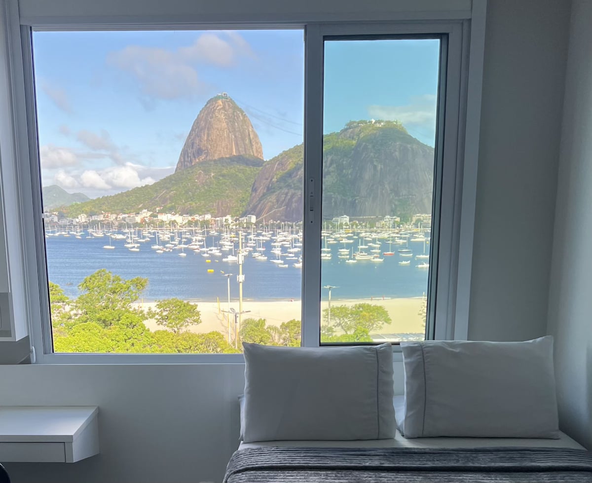 Estudio limpio con cama doble tamaño queen. El Airbnb tiene una impresionante vista frontal a la bahía de Guanabara y el Pan de Azúcar. Contempla el amanecer en la vista más increíble de Río de Janeiro. Hay escritorio para la oficina en casa, aire acondicionado de la unidad de ventana, televisor inteligente, nevera con congelador. Estufa de gas de dos anillos y el apartamento tiene un filtro de agua y ventiladores de techo en el salón y el dormitorio. Ducha cálida. A 5 minutos a pie de la estación de metro.